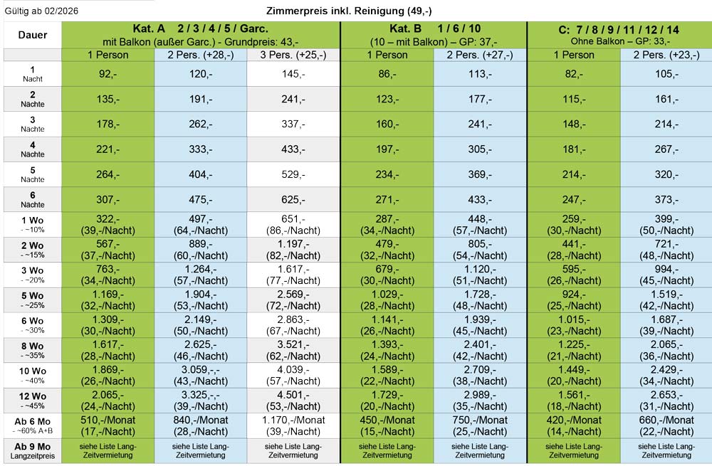 Bei einer Mietdauer ab 8 Wochen bei Einzelmietern kostet eine Übernachtung einer 2. Person nur € 9,00/Nacht bzw. Kat. A € 130,00, Kat. B € 110,00, Kat. C+D € 90,00/Monat.